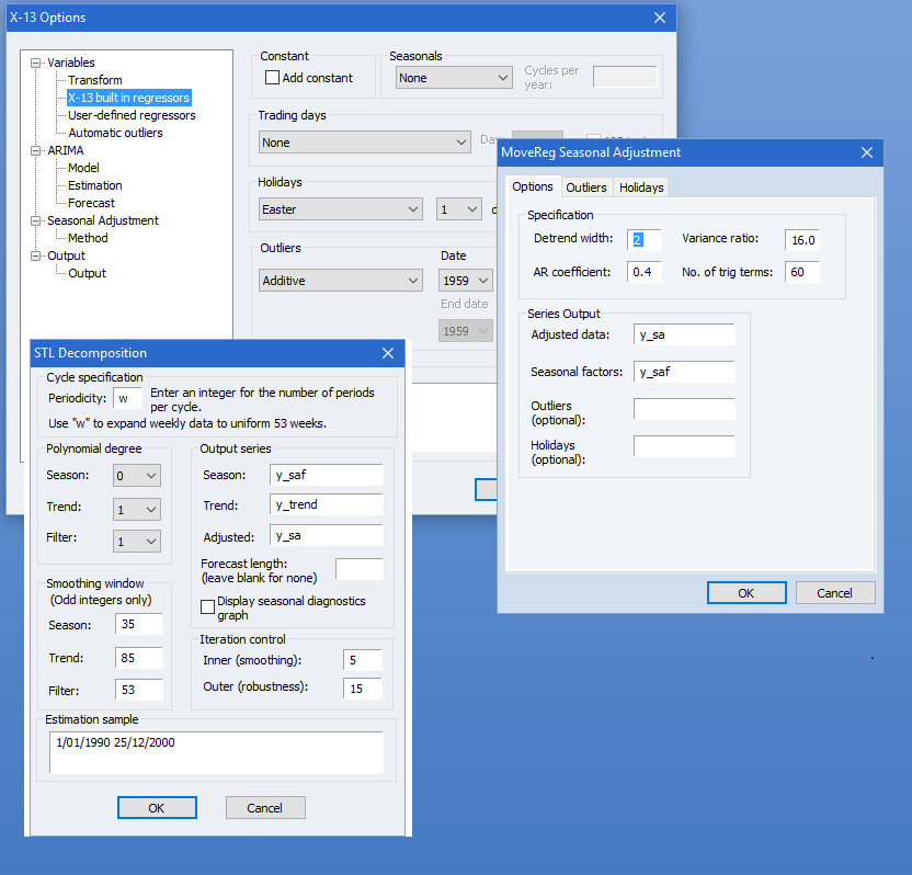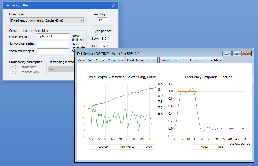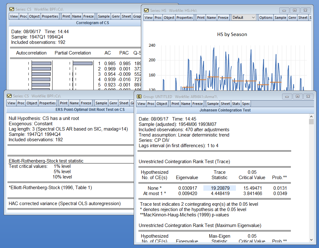 Time Series Statistics and ToolsExplore the time series properties of your data with tools ranging from simple autocorrelation plots to frequency filters to Q-statistics to unit root tests. EViews provides autocorrelation and partial autocorrelation functions, Q-statistics, and cross-correlation functions, as well as unit root tests (ADF, Phillips-Perron, KPSS, DFGLS, ERS, or Ng-Perron for single time series and Levin-Lin-Chu, Breitung, Im-Pesaran-Shin, Fisher, or Hadri for panel data), cointegration tests (Johansen with MacKinnon-Haug-Michelis critical values and p-values for ordinary data, and Pedroni, Kao, or Fisher for panel data), causality, and independence tests. EViews also provides easy-to-use front-end support for the U.S. Census Bureau's X-13 Seasonal Adjustment programs and MoveReg for weekly data from the U.S. Bureau of Labor Statistics. STL Decomposition provides seasonal adjustment for any frequency data, and simple seasonal adjustment using additive and multiplicative difference methods is also supported in EViews. You can even use EViews to compute trends and cycles from time series data using the Hodrick-Prescott, Baxter-King, Christiano-Fitzgerald fixed length and Christiano-Fitzgerald asymmetric full sample band-pass (frequency) filters. |