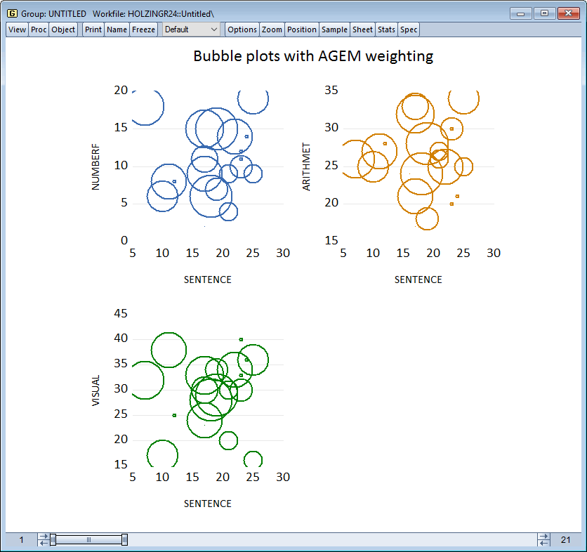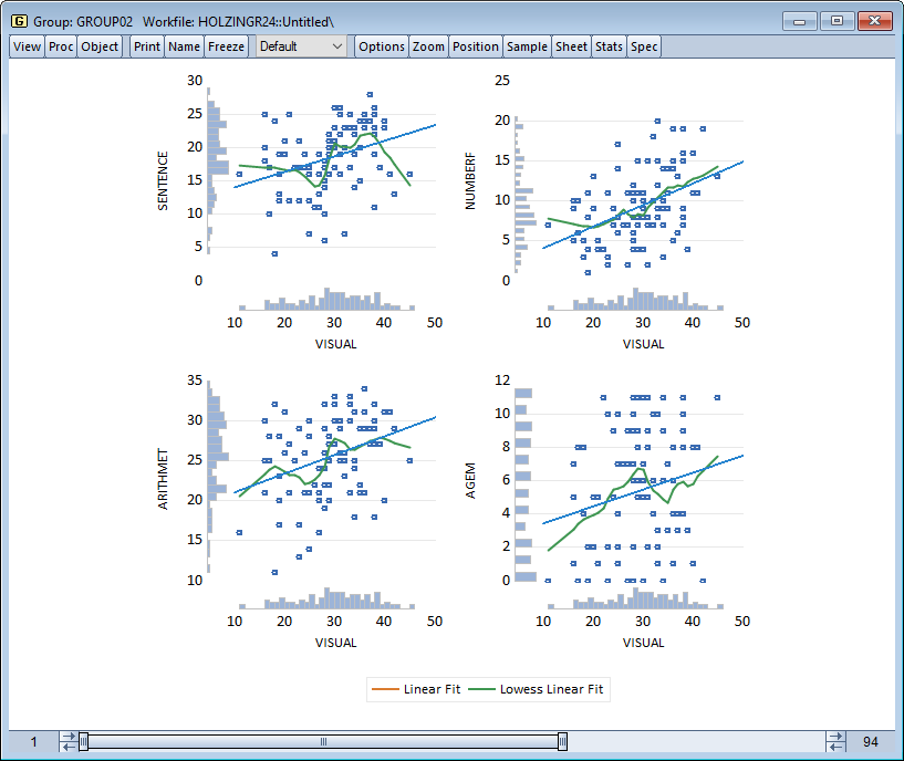 Basic Statistical AnalysisEViews supports a wide range of basic statistical analyses, encompassing everything from simple descriptive statistics to parametric and nonparametric hypothesis tests. Basic descriptive statistics are quickly and easily computed over an entire sample, by a categorization based on one or more variables, or by cross-section or period in panel or pooled data. Hypothesis tests on mean, median and variance may be carried out, including testing against specific values, testing for equality between series, or testing for equality within a single series when classified by other variables (allowing you to perform one-way ANOVA). Tools for covariance and factor analysis allow you to examine the relationships between variables. You can visualize the distribution of your data using histograms, theoretical distribution, kernel density, or cumulative distribution, survivor, and quantile plots. QQ-plots (quantile-quantile plots) may be used to compare the distribution of a pair of series, or the distribution of a single series against a variety of theoretical distributions. You can even perform Kolmogorov-Smirnov, Liliefors, Cramer von Mises, and Anderson-Darling tests to see whether your series is distributed normally, or whether it comes from another distribution such as an exponential, extreme value, logistic, chi-square, Weibull, or gamma distribution. EViews also produces scatter plots with curve fitting using ordinary, transformation, kernel, and nearest neighbor regression. Bubble plots allow you to use a third series to determine the size of the dots in a scatter plot. |