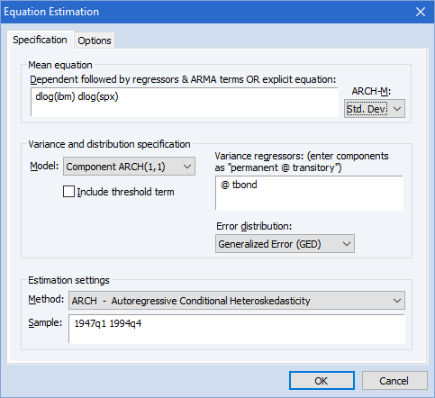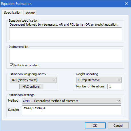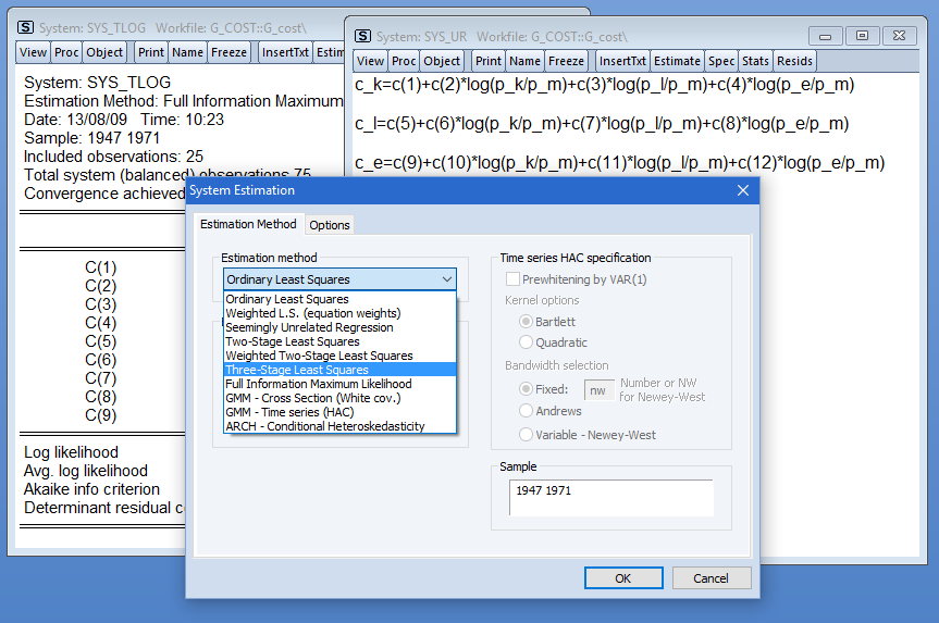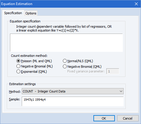 Single Equation EstimationEViews allows you to choose from a full set of basic single equation estimators including: ordinary and nonlinear least squares (multiple regression), weighted least squares, two-stage least squares (instrumental variables), quantile regression (including least absolute deviations estimation), and stepwise linear regression. Weighted estimation is available for all of these techniques. Specifications may include polynomial lag structures on any number of independent variables. For time series analysis, EViews estimates ARMA and ARMAX models, and a wide range of ARCH specifications. Structural time series models may be estimated using the state space object. In addition to these basic estimators, EViews supports estimation and diagnostics for a variety of advanced models. Generalized Method of Moments (GMM)EViews supports GMM estimation for both cross-section and time series data (single and multiple equation). Weighting options include the White covariance matrix for cross-section data and a variety of HAC covariance matrices for time series data. The HAC options include prewhitening, a variety of kernels, and fixed, Andrews, or Newey-West bandwith selection methods. You can estimate a GMM equation using either iterative procedures, or a continuously updating procedure. Post-estimation diagnostics for GMM equations, including weak instrument statistics, are also available. ARCHIf the variance of your series fluctuates over time, EViews can estimate the path of the variance using a wide variety of Autoregressive Conditional Heteroskedasticity (ARCH) models. EViews handles GARCH(p,q), EGARCH(p,q), TARCH(p,q), PARCH(p,q), and Component GARCH specifications and provides maximum likelihood estimation for errors following a normal, Student's t or Generalized Error Distribution. The mean equation of ARCH models may include ARCH and ARMA terms, and both the mean and variance equations allow for exogenous variables. Limited Dependent VariablesEViews also supports estimation of a range of limited dependent variable models. Binary, ordered, censored, and truncated models may be estimated for likelihood functions based on normal, logistic, and extreme value errors. Count models may use Poisson, negative binomial, and quasi-maximum likelihood (QML) specifications. EViews optionally reports generalized linear model or QML standard errors. Panel and Pooled Time Series-Cross SectionEViews offers various panel and pooled data estimation methods. In addition to ordinary linear and non-linear least-squares, equation estimation methods include 2SLS/IV and Generalized 2SLS/IV, and GMM, which can be used to estimate complex dynamic panel data specifications (including Anderson-Hsiao and Arellano-Bond types of estimators). Most of the methods allow for both time and cross-section fixed and random effects specifications. For random effects models, quadratic unbiased estimators of component variances include Swamy-Arora, Wallace-Hussain and Wansbeek-Kapteyn. Also supported are AR specifications (any effects are defined after transformation), weighted least squares, and seemingly unrelated regression. In pools, coefficients for specific variables (including AR terms) can be constrained to be identical, or allowed to differ across cross-sections. |
