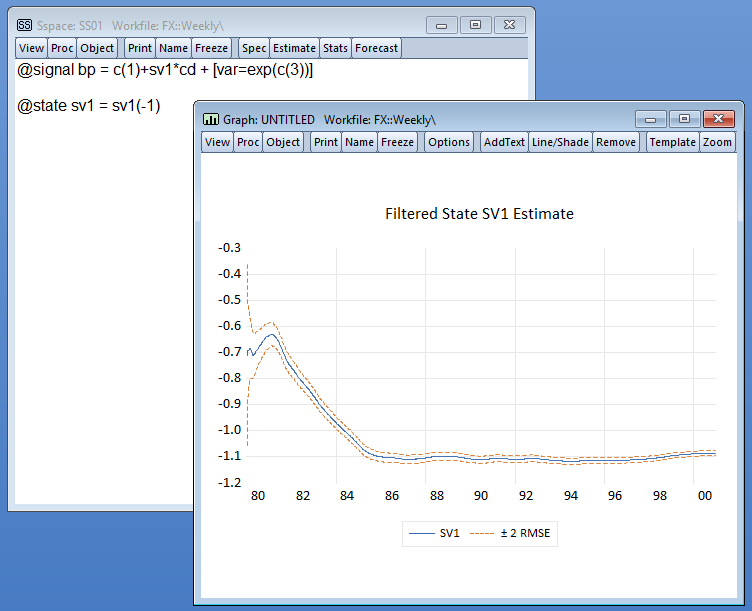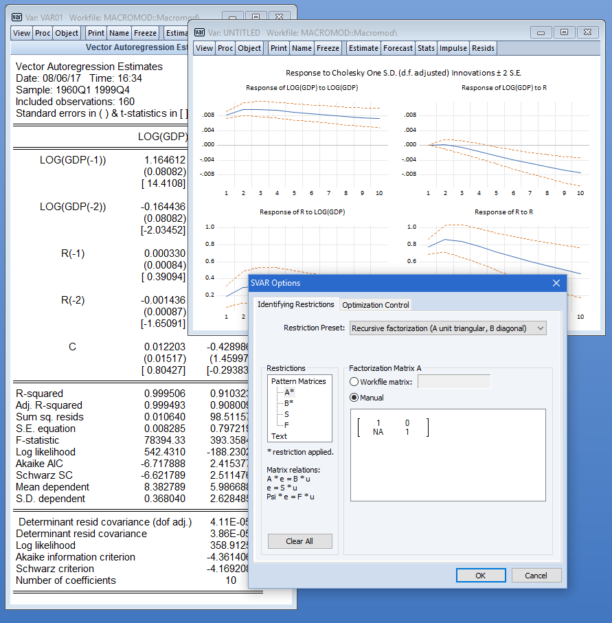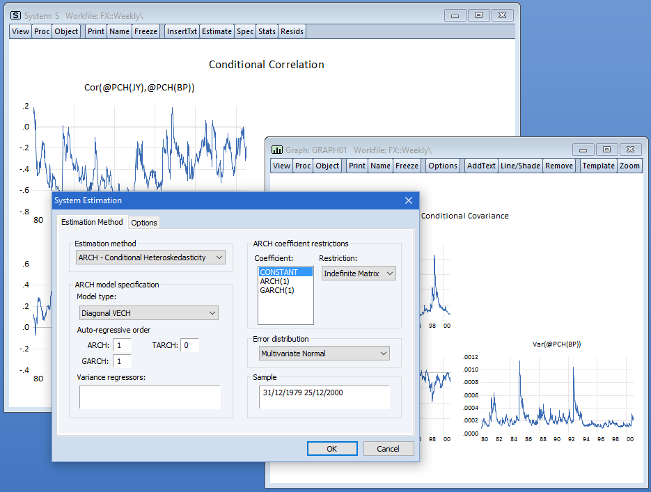 System EstimationEViews also offers powerful tools for analyzing systems of equations. You may use EViews to estimation of both linear and nonlinear systems of equations by OLS, two-stage least squares, seemingly unrelated regression, three-stage least squares, GMM, and FIML. The system may contain cross equation restrictions and in most cases, autoregressive errors of any order. Vector Autoregression/Error Correction ModelsVector Autoregression (including Bayesian VARs) and Vector Error Correction models can be easily estimated by EViews. Once estimated, you may examine the impulse response functions and variance decompositions for the VAR or VEC. VAR impulse response functions and decompositions feature standard errors calculated either analytically or by Monte Carlo methods (analytic not available for decompositions) and may be displayed in a variety of graphical and tabular formats. You may impose and test linear restrictions on the cointegrating relations and/or adjustment coefficients. EViews' VARs also allow you to estimate structural factorizations (VARs) by imposing short-run (Sims 1986) or long-run (Blanchard and Quah 1989) restrictions, or both. Over-identifying restrictions may be tested using the LR statistic reported by EViews. VARs support a variety of views to allow you to examine the structure of your estimated specification. With a few clicks of the mouse, you can display the inverse roots of the characteristic AR polynomial, perform Granger causality and joint lag exclusion tests, evaluate various lag length criteria, view correlograms and autocorrelations, or perform various multivariate residual based diagnostics. Multivariate ARCHMultivariate ARCH is useful in modeling time varying variance and covariance of multiple time series. A number of popular ARCH models, such as the Conditional Constant Correlation (CCC), the Diagonal VECH, and the Diagonal BEKK, are available. Exogenous variables are allowed in the mean and variance equations; nonlinear and AR terms can be included in the mean equations. The error is assumed to distributed either as multivariate Normal or Student's t. Bollerslev-Wooldridge robust standard errors are also available. Once the model is estimated, users can easily generate the in-sample variance, covariance, or correlation, in tabular or graphic format. State-Space ModelsThe state-space object allows estimation of a wide variety of single- and multi-equation dynamic time-series models using the Kalman Filter algorithm. Among other things, you can use the state-space object to estimate random and time-varying coefficient models and ML ARMA specifications. Sophisticated procs and views give you access to powerful filtering and smoothing tools so that you can view or generate one-step ahead, filtered, or smoothed signals, states, or errors. EViews' built-in forecasting procedures also provide easy-to-use tools for in- and out-of-sample forecasting using n-step ahead or smoothed values. |