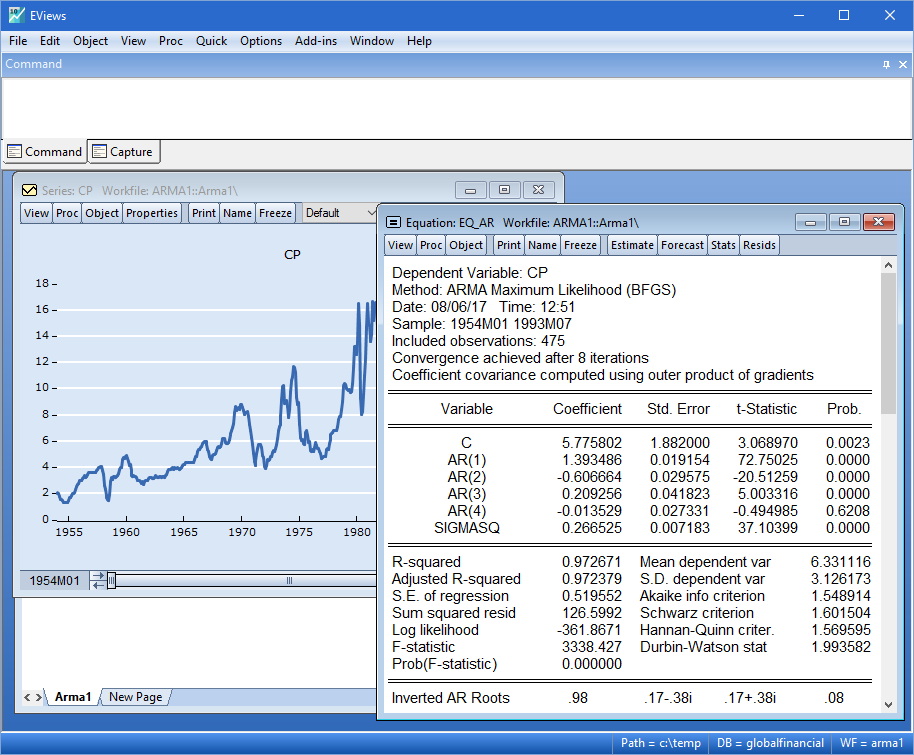 An Object-Based InterfaceAt the heart of the innovative EViews interface is the concept of an object. Series, equations, and systems are just a few examples of objects. Each object has its own window, menus, procedures, and its own views of its data. Most statistical procedures are simply alternate views of the object. For example, a simple menu choice from a series window changes the display between a spreadsheet, various graph views, descriptive statistics and tests, tabulations, correlograms, unit root, and independence tests. Similarly, an equation window allows you to switch between a display of the equation specification, basic estimation results, actual-fitted-residual graphs and tables, a display of the equation ARMA structure (if appropriate), gradients and derivatives of the specification, the coefficient covariance matrix, forecast graphs and evaluations, and over a dozen diagnostic and hypothesis tests. |
