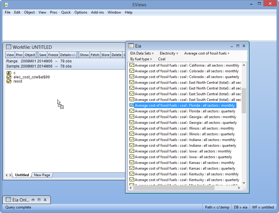 In order to use the EIA connection to EViews, you must first obtain a free API key from the EIA's website, and must be using EViews Enterprise.