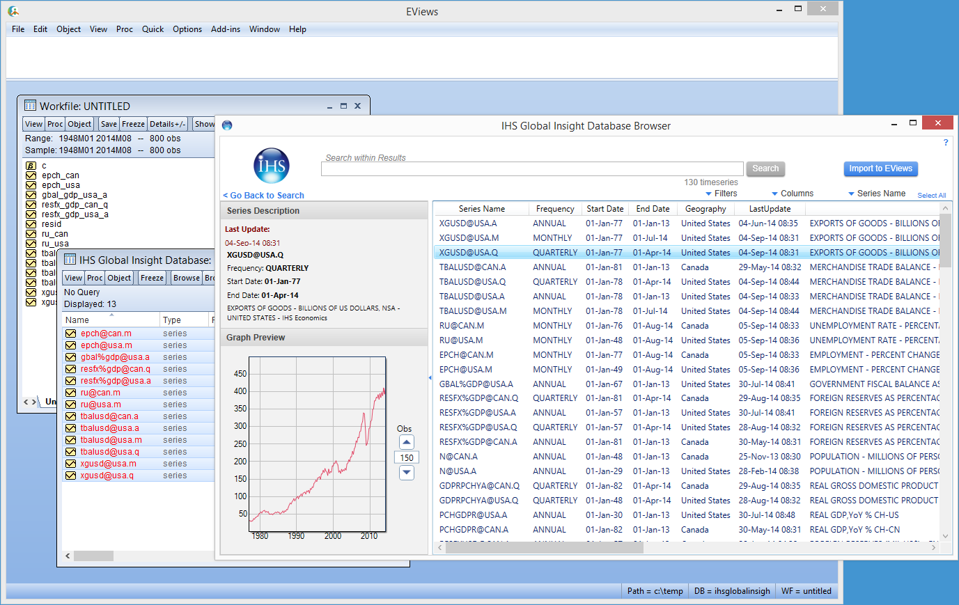 For full documentation on using S&P Global data within EViews, please download the S&P Global Database Extension for EViews pdf.
