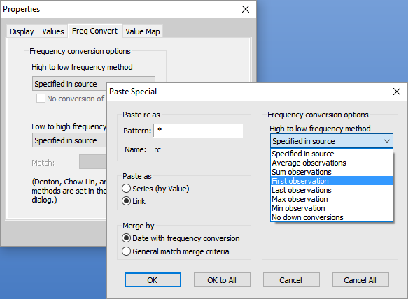 Frequency ConversionWhen you import data from a database or from another workfile or workfile page, it is automatically converted to the frequency of your current project. EViews offers many options for frequency conversion, and includes support for the conversion of daily, weekly, or irregular-frequency data. Series may be assigned a preferred conversion method, allowing you to use different methods for different series without having to specify the conversion method every time a series is accessed. You can even create links so that the frequency converted data series are automatically recalculated whenever the underlying data is modified. |
