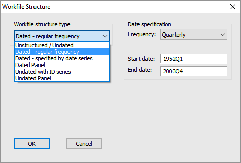 Data Structures and TypesEViews can handle complex data structures, including regular and irregular dated data, cross-section data with observation identifiers, and dated and undated panel data. In addition to numerical data, an EViews workfile can also contain alphanumeric (character string) data, and series containing dates, all of which may be manipulated using an extensive library of functions. EViews also provides a wide range of tools for working with datasets (workfiles), data including the ability to combine series by complex match merge criteria and workfile procedures for changing the structure of your data: join, append, subset, resize, sort, and reshape (stack and unstack). |