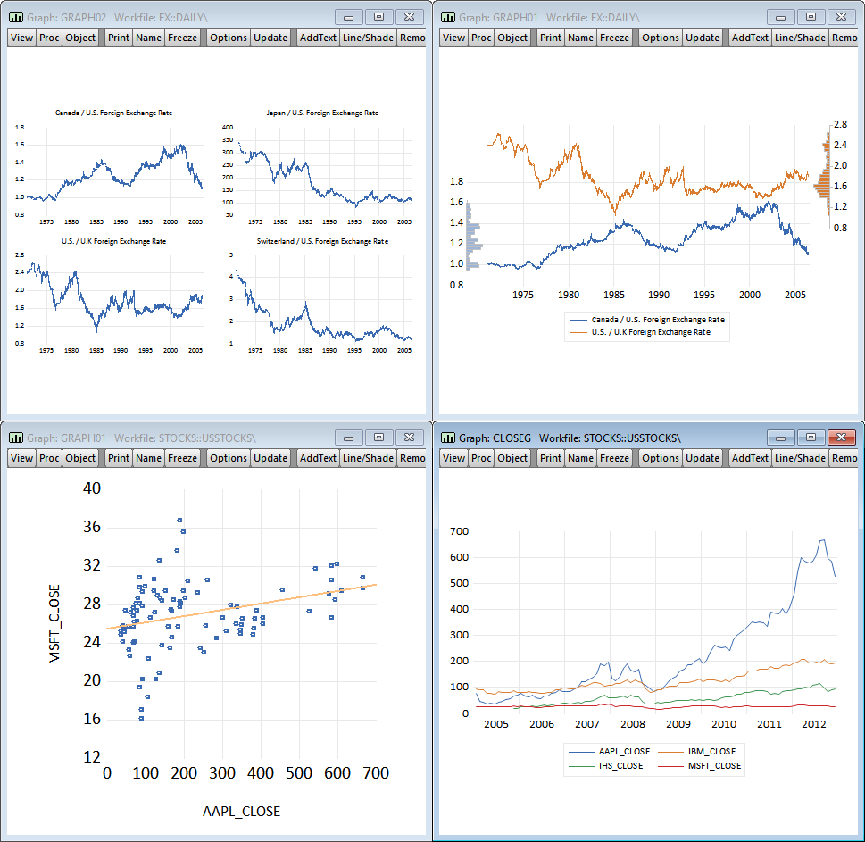 Part 4: Presentation Quality OutputEViews supports a wide range of basic graph types including line graphs, bar graphs, filled area graphs, pie charts, scatter diagrams, mixed line-bar graphs, high-low graphs, scatterplots, and boxplots. Any number of graphs can be combined in a single graph for presentation. Various options give you control over line types, symbols, color, frame and border characteristics, headings, shading, and scaling, including logarithmic scaling and dual scale graphs. Legends are created automatically. You may further customize your graph by adding labels in any scalable Windows font. Customizing a graph is as simple as modifying or moving graphic elements on the screen. Everything from aspect ratios, to line and symbol characteristics, to axes scaling and labeling is right at your fingertips. Want to change the font or other characteristics of a legend or a text label? Just click on an element of the graph and your choices are presented in an easy to understand dialog. You can even use a customized graph template to modify all of your graph settings at once. You can quickly incorporate customized graphs into other applications using copy-and-paste or by writing the graph to a Windows metafile, or a PostScript, bitmap, PNG, GIF, or JPEG file.