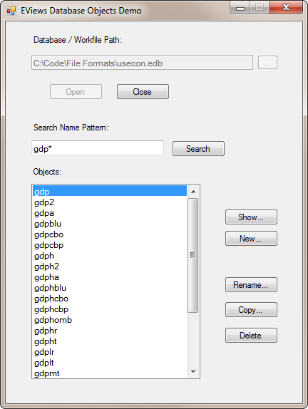EViews Database Objects Library (EDO)The EDO library allows you to work with data stored in EViews file formats from within other applications. EDO makes it simple to pull the finished results of your work directly from your EViews workfile, or to write a simple application to regularly update your EViews database from an external data source. |