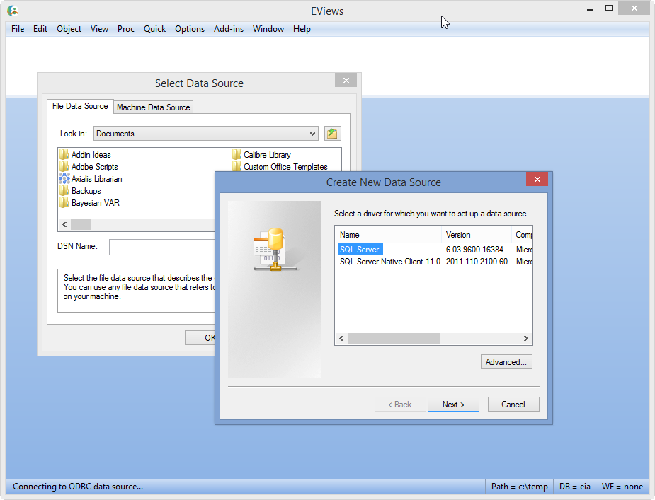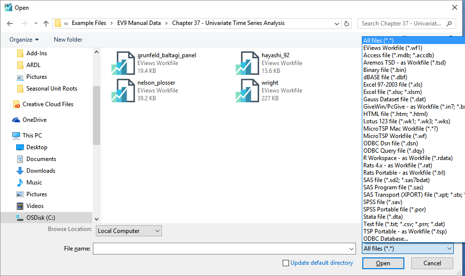 File Import and ExportExchanging data with other programs is easy, since EViews reads and writes over 20 popular data formats (including Excel, formatted and unformatted ASCII/Text, R data, SPSS, SAS (transport), Stata, SPSS, HTML, Microsoft Access, Gauss Dataset, and more). Simply drag-and-drop your foreign file onto EViews and your data will automatically appear in an EViews workfile. Or use the easy-to-use dialogs and wizards to cutomize the importing of your data. |