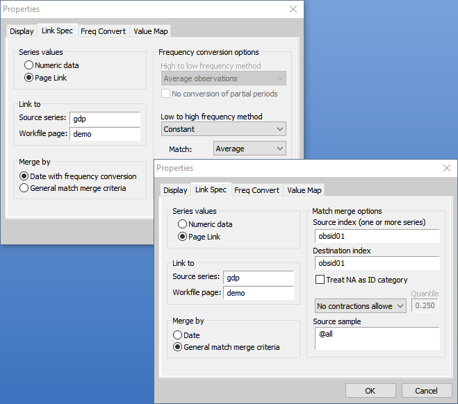 Links, Formulas and Values MapsLink objects allow you to create series that link to data contained in other workfiles or workfile pages. Links allow you to combine data at different frequencies, or match merge in data from a summary page into an individual page such that the data is dynamically updated whenever the underlying data change. Similarly, within a workfile, formulas can be assigned to data series so that the data series are automatically recalculated whenever the underlying data is modified. Value labels (e.g., "High", "Med", "Low", corresponding to 2, 1, 0) may be applied to numeric or alpha series so that categorical data can be displayed with meaningful labels. Built-in functions allow you to work with either the underlying or the mapped values when performing calculations. |