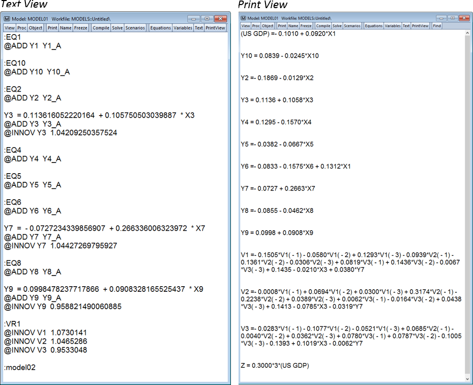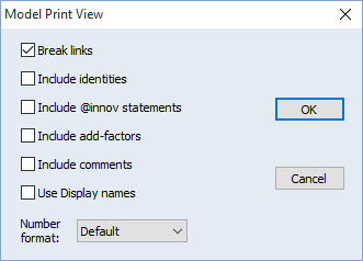 Print View (available from the PrintView button, or from View/Print View) offers a new way of looking at the underlying equations in your model. This new feature produces a text representation of the Model, allowing you to display equations in broken form without having to break the link to the underlying equation object, and allows you to specify output features such as display decimal places and whether to use variable display names or not.