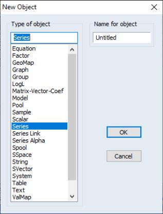 A second method of creating a series is to generate the series using mathematical expressions. Click on in the main EViews menu, and enter an expression defining the series. We will discuss this method in depth in the next chapter.