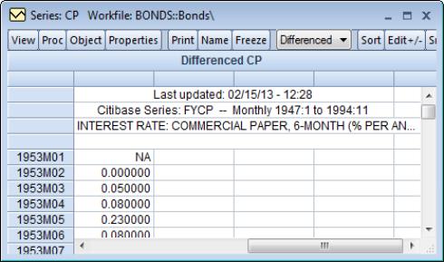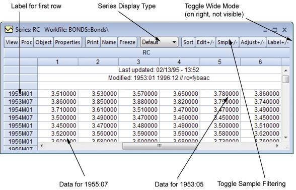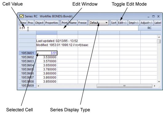Here we see a series spreadsheet window in edit mode. Notice the presence of the edit window just beneath the series toolbar containing the value of RC in 1953M01, and the box around the selected cell in the spreadsheet; neither are present in protected mode.