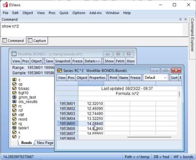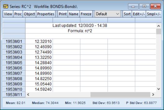 Series expressions will be discussed in greater depth later. For now, it suffices to note that series expressions are mathematical expressions that may involve one or more series (e.g. “7/2” or “3*X*Y/Z”). EViews will automatically evaluate the expressions for each observation and display the results as if they were an ordinary series. Users of spreadsheet programs will be familiar with this type of automatic recalculation.