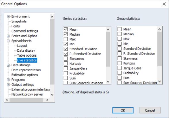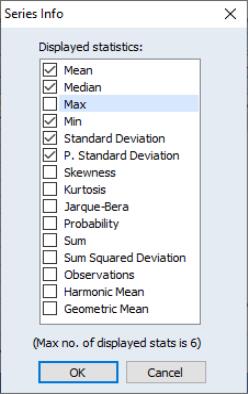 Double-clicking on the bottom bar of the series window brings up a menu where the statistics shown can be changed. A maximum of six statistics may be displayed at once. The window may need to be resized to display all the statistics.