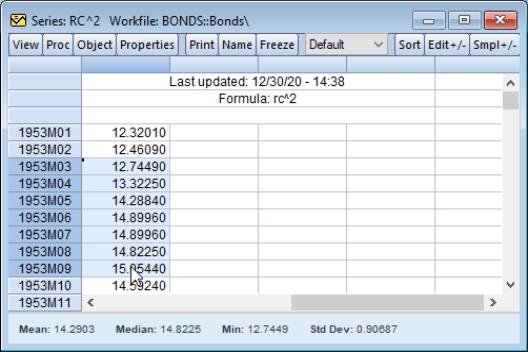 Once you click on , EViews will accept the current settings and change the spreadsheet display to reflect your choices. In addition, these display settings will be used whenever the series spreadsheet is displayed or as the default settings when the series is used in a group spreadsheet display.