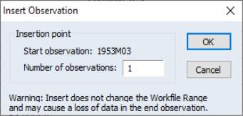 If you choose to insert a single observation, EViews will insert a missing value at the appropriate position and push all of the observations down so that the last observation will be lost from the workfile. If you wish to preserve this observation, you will have to expand the workfile before inserting observations. If you choose to delete an observation, all of the remaining observations will move up, so that you will have a missing value at the end of the workfile range.