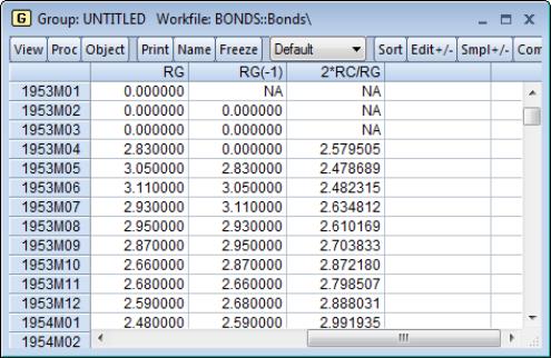 Here, for example, is a spreadsheet view of an untitled group containing the series RC, a series expression for the lag of RG, RG(–1), and a series expression involving RC and RG.