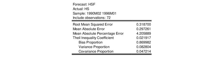 Suppose we construct a dynamic forecast for HS over the period 1990M02 to 1996M01 using our estimated housing equation. If the Forecast evaluation option is checked, and there are actual data for the forecasted variable for the forecast sample, EViews reports a table of statistical results evaluating the forecast: