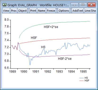 For the example output, the bias proportion is large, indicating that the mean of the forecasts does a poor job of tracking the mean of the dependent variable. To check this, we will plot the forecasted series together with the actual series in the forecast sample with the two standard error bounds. Suppose we saved the forecasts and their standard errors as HSF and HSFSE, respectively. Then the plus and minus two standard error series can be generated by the commands:
