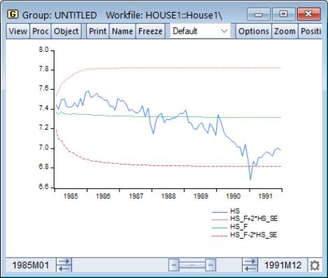 The large variance proportion indicates that the forecasts are not tracking the variation in the actual HS series. To plot the actual and forecasted series together with the two standard error bands, you can type: