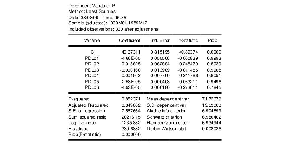 F-statistic (though with a very low Durbin-Watson statistic). This is a typical symptom of high collinearity among the regressors and suggests fitting a polynomial distributed lag model.