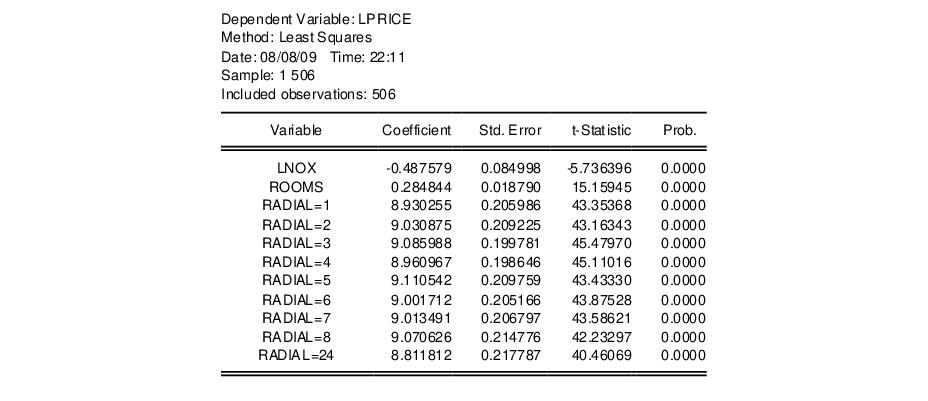 Following Wooldridge (2000, Example 3.9, p. 106), we regress the log median housing price, LPRICE, on a constant, the log of the amount of pollution (LNOX), and the average number of houses in the community, ROOMS, using data from Harrison and Rubinfeld (1978). The data are available in the workfile “Hprice2.WF1”.