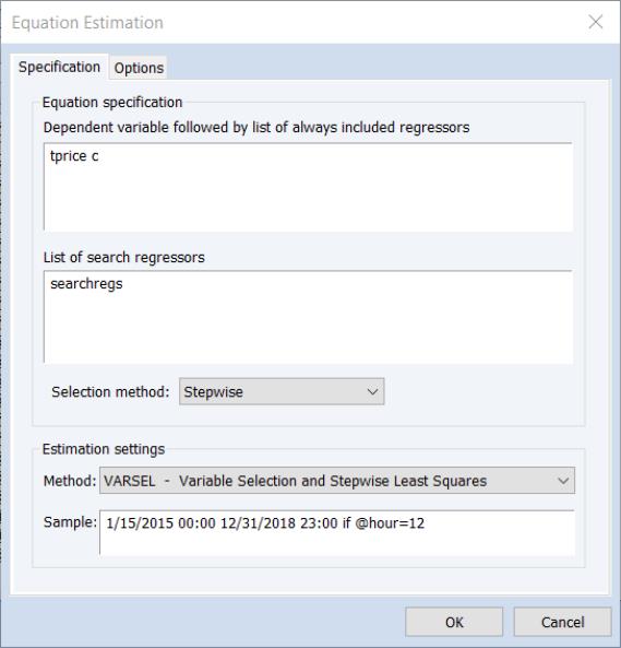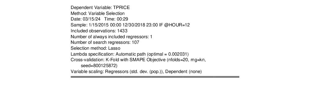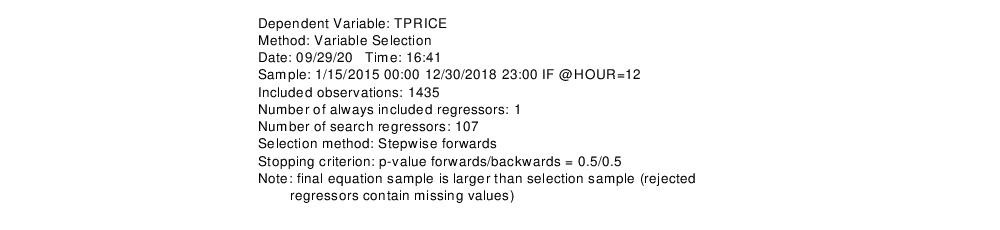 As an example of using variable selection in EViews, we will estimate a model of hourly electricity spot prices. We will follow, in spirit, the analysis done in Uniejewski, Nowotarski and Weron (2016), estimating a model with a large number of candidate variables to try to perform a one day-ahead forecast of the spot price.