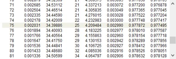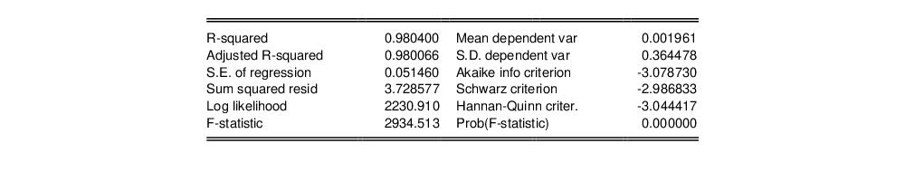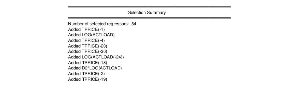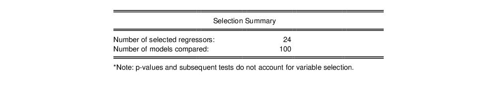 The output from this estimation is similar to the previous two; the upper portion describes the selection method, the middle displays the final model’s coefficient estimates and associates statistics, and the bottom provides some small detail on the selection process. In contrast to the stepwise procedure, Auto-search has only selected 27 regressors.