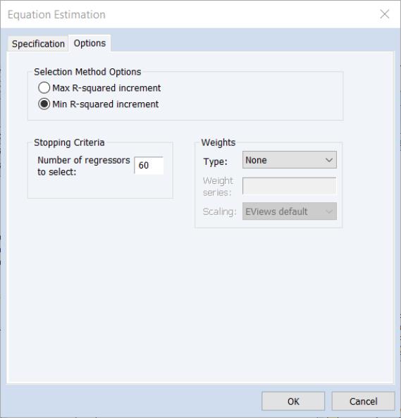 Switching to the tab, we switch to and instruct EViews to find the best 60 regressors (which seems a reasonable number given the stepwise procedure’s selection of 54).