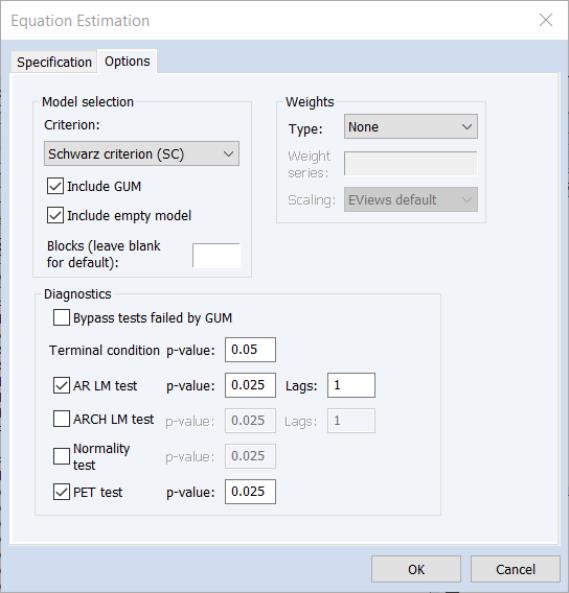 Our third estimation will use the Auto-search/GETS algorithm. On the page, change the to , and then click on the tab to alter some of the default settings. We’ll change the criteria used to decide between the final candidate models to the Schwarz criterion using the dropdown. We also elect to only use the AR LM test and PET tests as diagnostic tests during the path search.