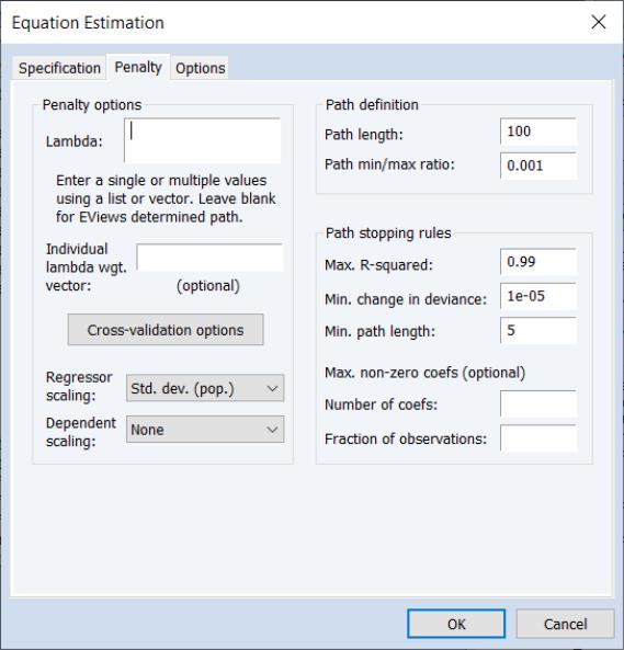 Under the menu EViews also offers views from elastic net estimation. Of particular interest is the view which (among other graphs) plots the (anywhere) non-zero coefficients against the lambda path: