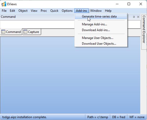 Add-ins are integrated into the EViews menus and command line so that they work much like built-in routines. To run an Add-in program, simply select the corresponding menu entry or issue the appropriate command.