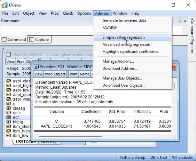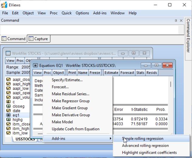 To run the simple rolling regression Add-in you may select either the main or the equation menu Add-ins entries, or you may enter the equation object command: