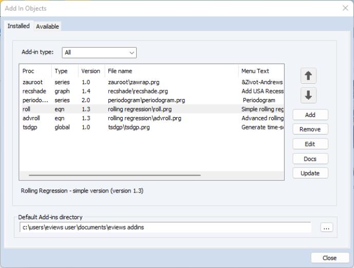 In this example, the Recshade (Add USA Recession Shading, ROLL (Simple Rolling Regression), and Advroll (Advanced Rolling Regression), Add-ins are all object-specific, while the Tsdgp (Generate time series data) Add-in is global.