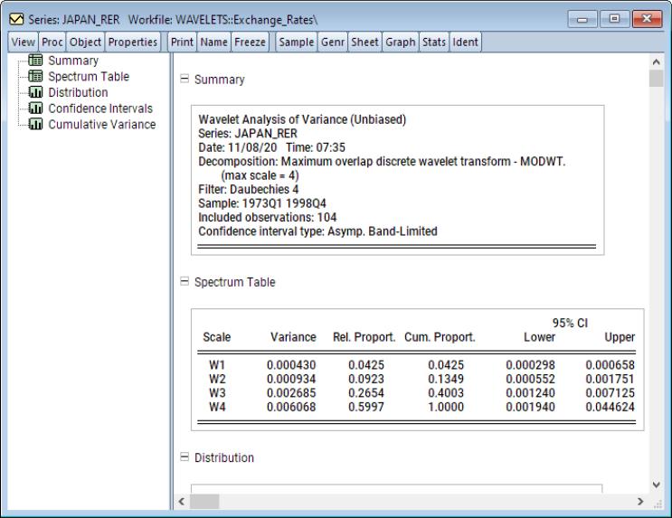 The first spool entry is a summary of the wavelet variance decomposition performed including information about the decomposition and filter, sample, and the confidence intervals settings.