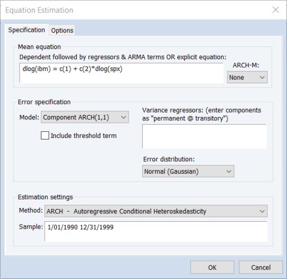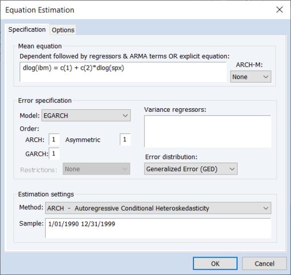Notice that we have specified the mean equation using an explicit expression. The use of the explicit expression here is for illustration purposes only; since the expression is linear in the regressors, we could just as well have entered “dlog(ibm) c dlog(spx)” as our specification.