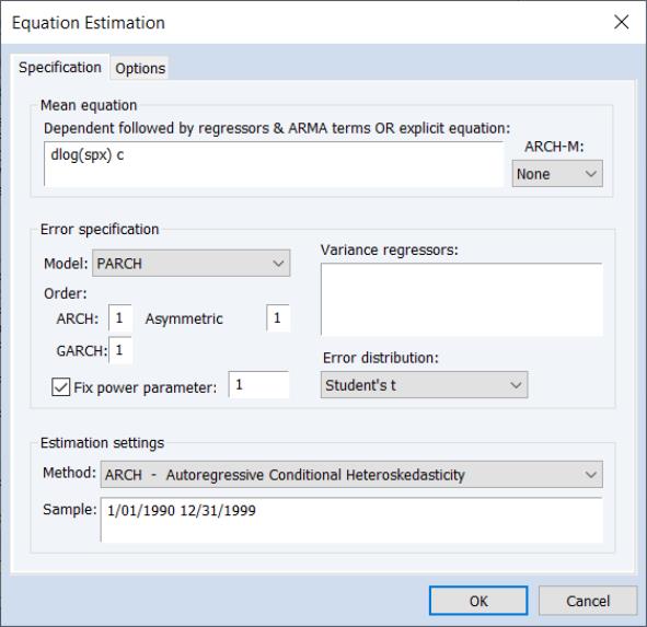 To estimate this model, simply select the PARCH in the model specification dropdown menu and input the orders for the , and terms. EViews provides you with the option of either estimating or fixing a value for