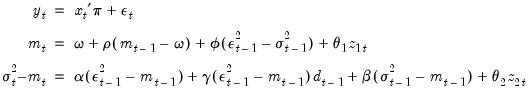 In some cases, you might wish to estimate an ARCH model not mentioned above, for example a special variant of PARCH. Many other ARCH models can be estimated using the logl object. For example,