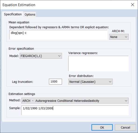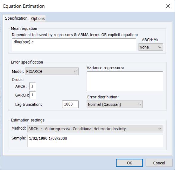 Note that since as EViews only supports the FIEGARCH(1, 1) specification, you may not specify the number of ARCH and GARCH terms.