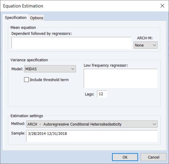 EViews will display the base ARCH dialog. Change the drop down menu in the middle of the page to to display the MIDAS GARCH page:
