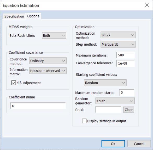The randomization procedure is governed by the specified and the random fields. You may provide an integer value from 0 to 2,147,483,647, or you may the leave the field blank, in which case EViews will use the clock to obtain a seed at the time of estimation.