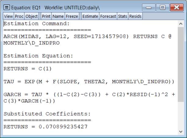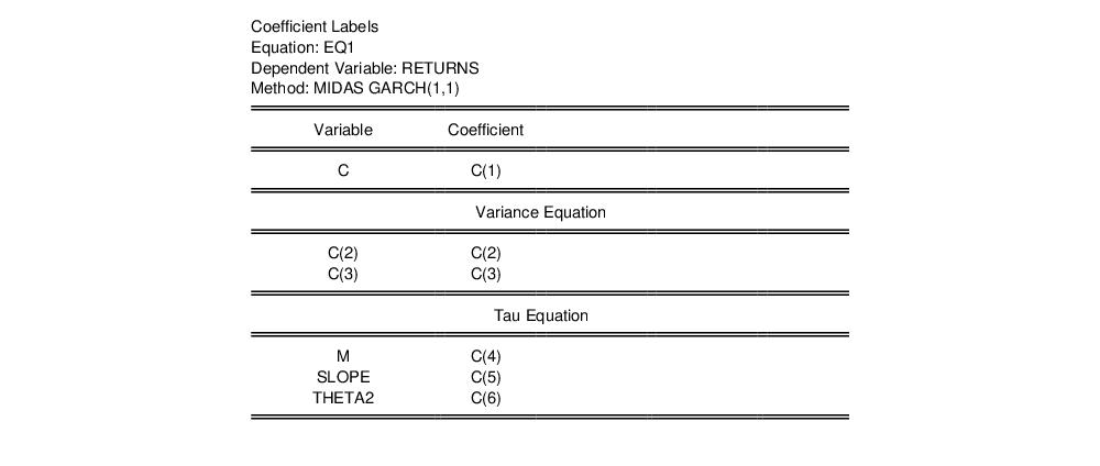 In contrast to most EViews Representations views, however, the MIDAS GARCH Representations view does not provide expressions that may be evaluated using the EViews. Notably, the equation for TAU is only a pseudo-representation of the permanent component specification. Thus, the TAU and GARCH equations may not be evaluated without additional modification.