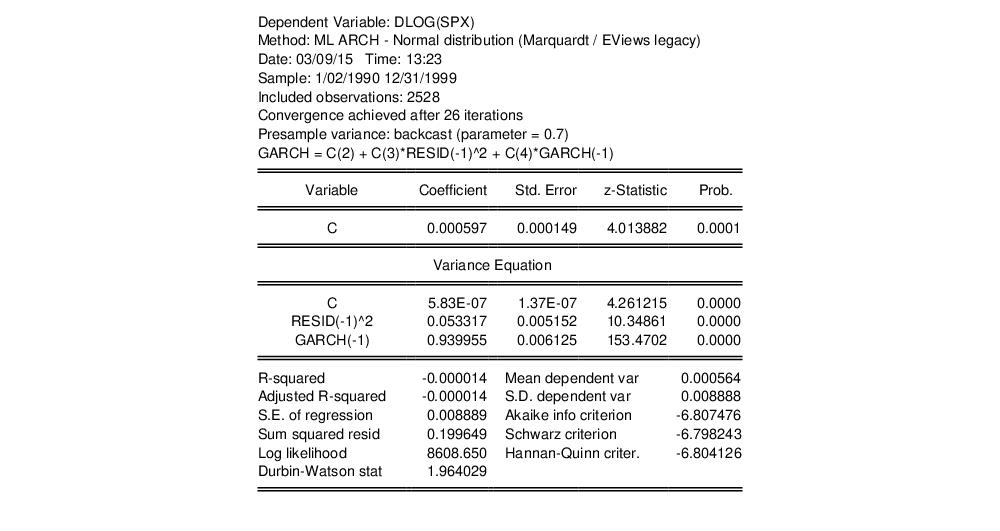 As an example, we fit a GARCH(1,1) model to the first difference of log daily S&P 500 (DLOG(SPX)) in the workfile “Stocks.WF1”, using backcast values for the initial variances and computing Bollerslev-Wooldridge standard errors. The output is presented below: