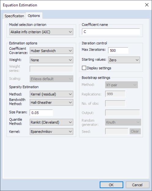For QARDL models, the options tab of the estimation dialog provides options for quantile estimation:
