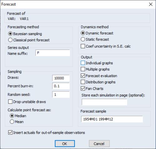 A closed form solution for the posterior distributions of the independent normal-Wishart prior does not exist, so estimation is performed using a Gibbs sampler. Consequently, calculation of impulses or forecasts from the VAR also require use of a Gibbs sampler. Specifically, the sampler is run identically as to during estimation, but at each draw of alpha and Sigma during the sampler, an impulse response or forecast is computed from the draws. Note that the same random number generator seed used during estimation will be used for draws of alpha and Sigma. For forecasting the seed specified on the forecast dialog is used for draws of the residuals at each stage of the sampler.