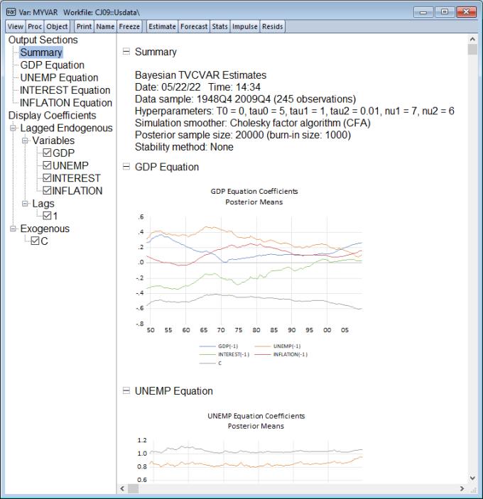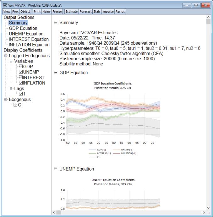 Estimation output for the BTVCVAR is presented as a spool object. A summary is provided at the top, followed by graphs showing the evolution of coefficients over time for each equation.