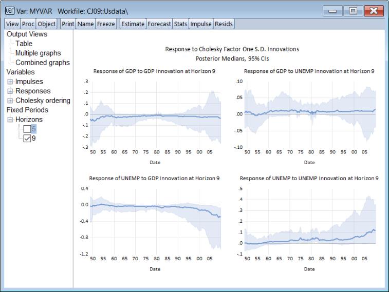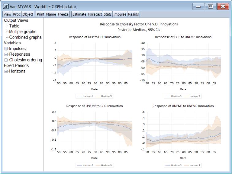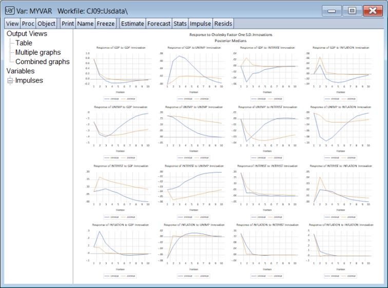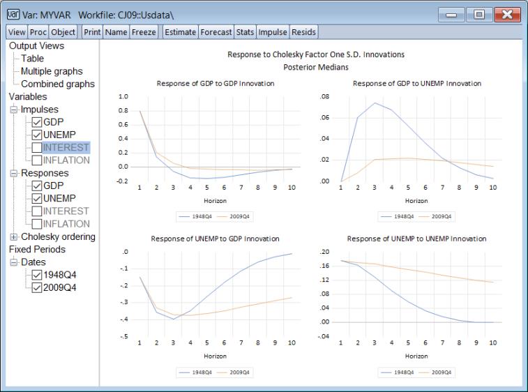 EViews will compute and display impulse responses for all of the variables using both the 1948Q2 and 2009Q4 posterior median coefficient values:
