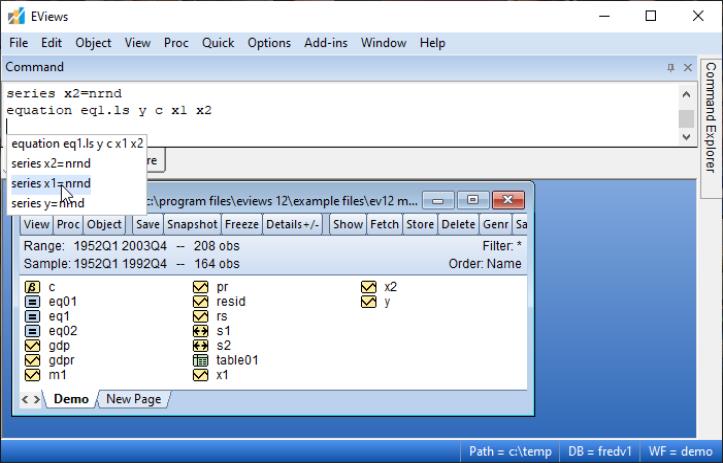 You may instruct EViews to auto-complete the name of the object or object command you are in the middle of typing. This feature is particularly useful in workfiles with long series names or when issuing a series of commands. (Note that auto-complete is only enabled when there is a workfile open).