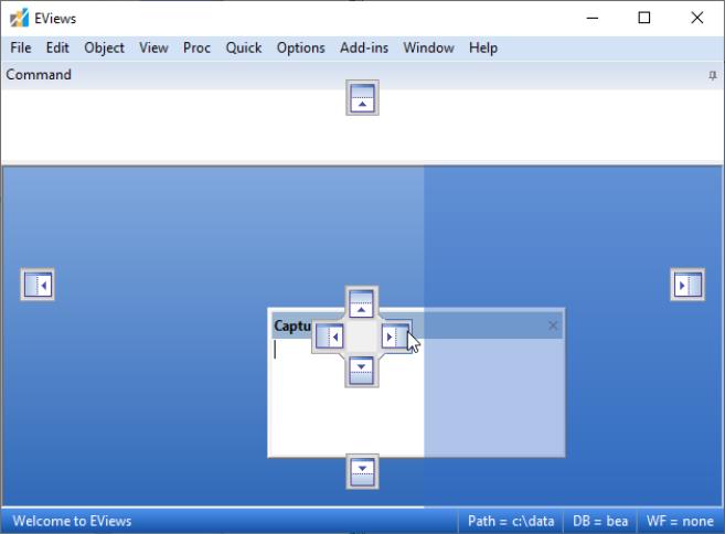 Both the command and capture window panes can now be docked on any side inside the main EViews window. Begin dragging the pane by left-clicking title bar and holding it down as you drag it off the edge. At that point, you will see small docking guides appear inside the main EViews window: