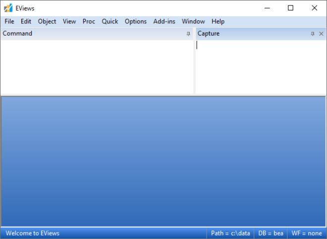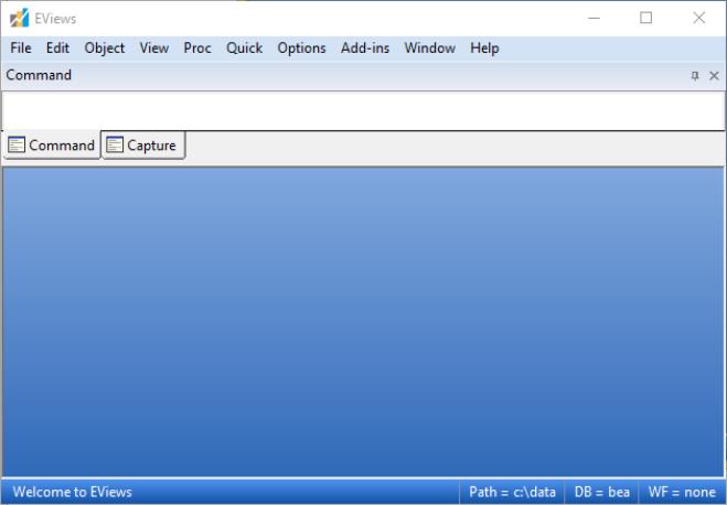 The command window is located (by default) just below the main menu bar at the top of the EViews window. A blinking insertion cursor in the command window indicates that keyboard focus is in the command window and that keystrokes will be entered in the window at the insertion point. If no insertion cursor is present, simply click in the command window to change the focus.